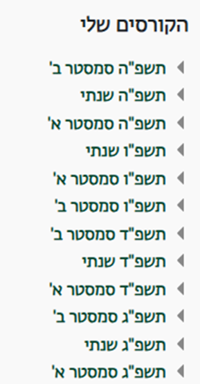 2. בסרגל זה נוכל לראות את כל הקורסים הזמינים כרגע בחלוקה סמסטריאלית. ניתן לגשת לסרגל המשבצות הצדדי מכל עמוד באתר.