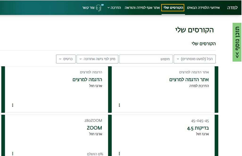 3. לחלופין, ניתן לבחור בסרגל העליון באפשרות "הקורסים שלי", ולהגיע לעמוד המפרט את כלל הקורסים.