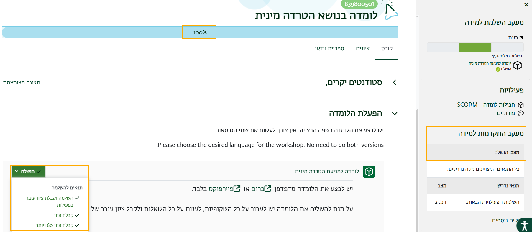 ג. לצד הקישור ללומדה, שם יופיעו תנאי ההשלמה והאם מולאו.