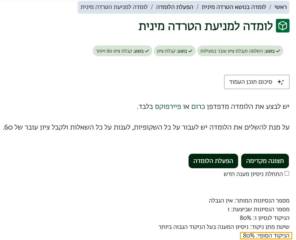 בלחיצה על הקישור ללומדה נוכל גם לראות את הציון הסופי: