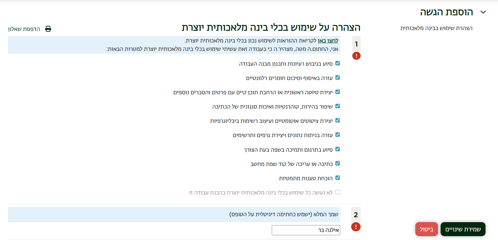 בעת הגשת המטלה, הסטודנטים נדרשים למלא הצהרה המפרטת האם נעשה שימוש בבינה מלאכותית, ובאילו שלבים או לצורך אילו מטרות נעשה שימוש זה: