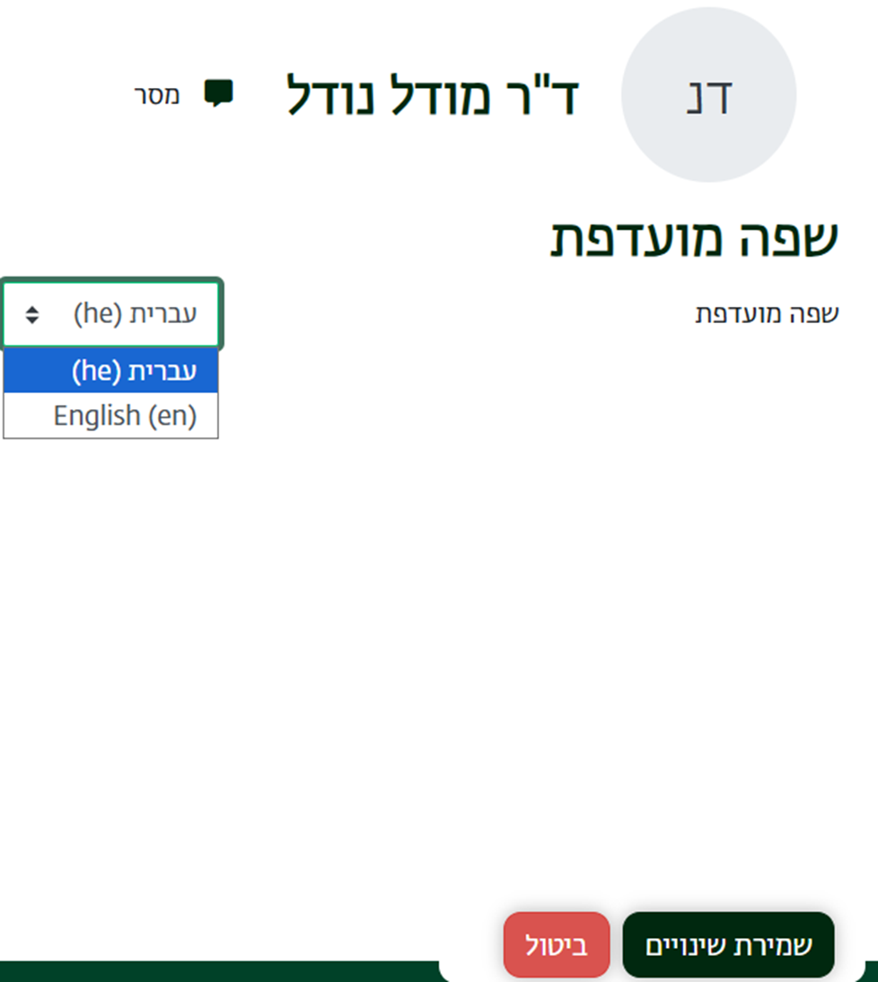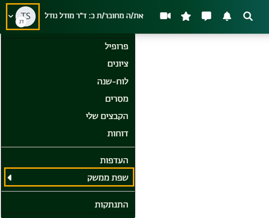 ניתן לשנות את שפת התצוגה לשפה האנגלית, לאחר ההתחברות, באמצעות לחיצה על הפרופיל האישי, ואז שפת ממשק.