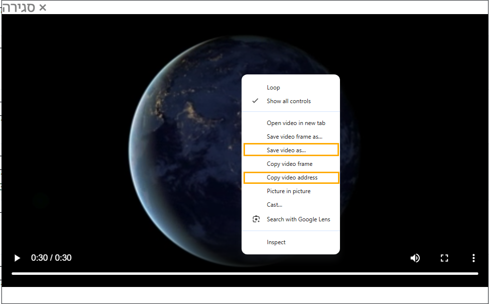 בתפריט נבחר "Save Video As" להורדה ההקלטה למחשב, או "Copy video Address" להעתקת הקישור לשיתוף: